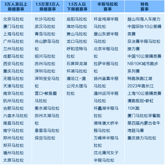 本報告選取2023年全國50(常規賽事)+10(特色賽事)場不同規模、不同特色的路跑賽事作為分析案例。