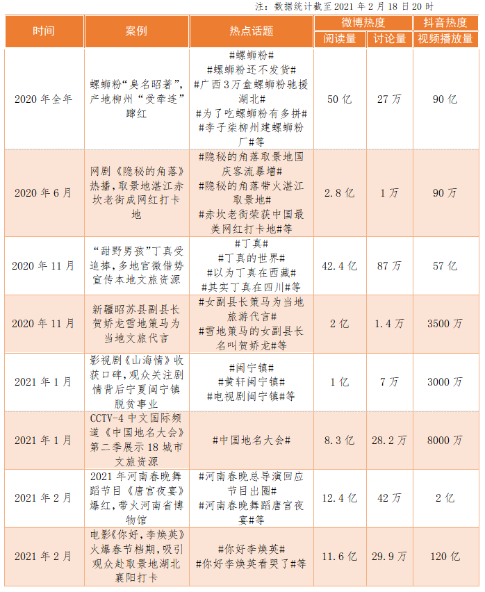 文旅資源作為一項核心資產,彰顯著地域個性特色和人文底蘊,成為區域差異化競爭的重要資本。在流量經濟時代,各地無論資源多寡,都不同程度地產生了“酒香也怕巷子深”的擔憂。觀察2020年以來新浪微博平臺、抖音短視頻平臺的區域傳播相關熱點,不少地方在文旅資源推介方面或深謀遠慮,或匠心獨具,或多年砥礪,或無心插柳,共同在互聯網上創造了超百億閱讀量級的文旅傳播熱潮。