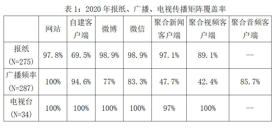 2020年,主流媒體通過建設自有平臺、入駐第三方平臺等方式,繼續壯大融合傳播矩陣。除廣播頻率在聚合視頻客戶端的入駐率較低外,報紙、廣播和電視的網站、自建客戶端等自有平臺的開通率,以及在微博、微信、聚合新聞客戶端、聚合音/視頻客戶端等第三方平臺的入駐率都較高,超過67%。其中電視臺及旗下頻道、欄目在各渠道的總體覆蓋率高于報紙和廣播。