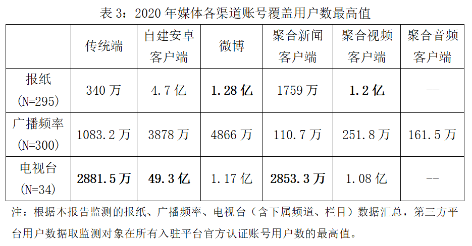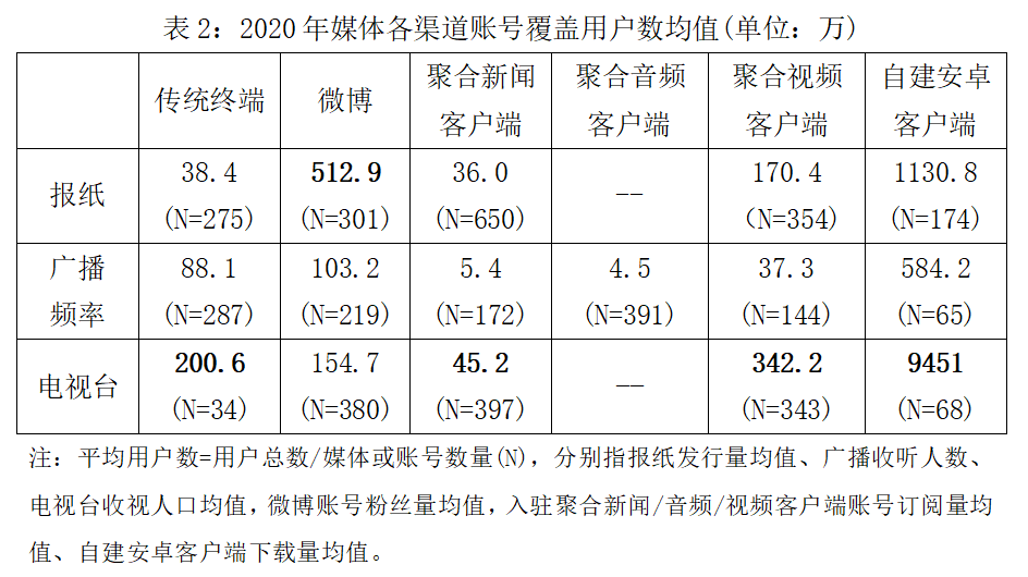 除了微博以外,電視在所有渠道的平均用戶數都高于報紙和廣播。同時從各渠道賬號覆蓋用戶數最高值來看,電視也占據領先優勢,總體上傳播力更強。