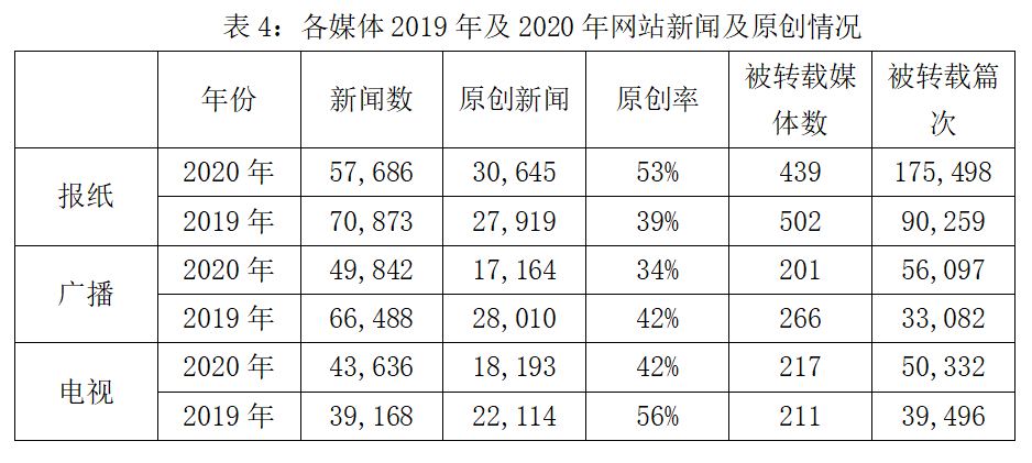 2020年正值抗擊新冠肺炎疫情的重要階段,人員隔離需要使得媒體的新聞報道受到較大影響,總體上新聞報道數量下降,但各類媒體仍然為廣大人民群眾了提供了大量快捷、權威、準確的新聞報道,成為權威信息來源,報紙、廣播、電視被轉載新聞篇次均顯著增長,其中報紙網站的平均原創新聞量(30645篇)、原創率(53%)、被轉載新聞篇次(17.5萬)在三類媒體中最高。