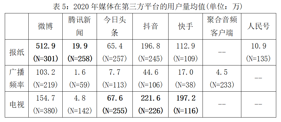 建好自主可控的傳播平臺,用好商業化、社會化的互聯網平臺,是建設新型主流媒體、構建全媒體傳播格局的重要途徑。2020年,考察范圍內的275份報紙,在包含傳統終端和自建客戶端的自有平臺的平均用戶總數為753.8萬,在包含微博、聚合新聞客戶端、聚合視頻客戶端的第三方平臺的平均用戶總數為865.8萬;278個廣播頻率的自有平臺的平均用戶總數為220.4萬,第三方平臺的平均用戶總數為106.8萬;34家電視臺的自有平臺的平均用戶總數為1.91億,第三方平臺的平均用戶總數為5709萬。除了報紙外,廣播、電視的自有平臺平均用戶總數都高于第三方平臺。兩種平臺都成為重要的傳播渠道。