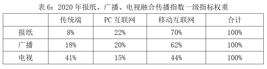 此外,指標體系中報紙、廣播自有平臺與第三方平臺的權重基本上各占一半。電視的自有平臺與第三方平臺的權重比例為66:34,其自有平臺(含傳統電視、網站及自有客戶端)仍是電視類媒體的主要傳播渠道。