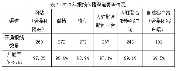 報紙在各個傳播渠道的布局較為完善。275份報紙自建網站、客戶端的比率分別為97.8%和69.5%,較2019年均有小幅下降;微博、微信入駐率均為98.9%,已經成為報紙普遍覆蓋的傳播渠道;報紙入駐聚合新聞客戶端和入駐聚合視頻客戶端的比例分別為97.1%和89.1%,較2019年均有所增長,其中報紙入駐抖音的比率增長了23個百分點。