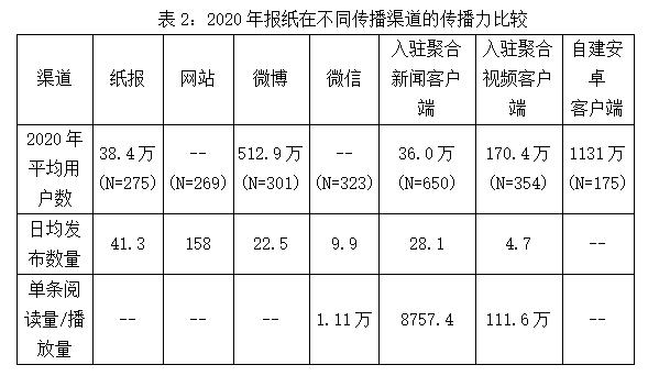 2020年,各級報紙發行量均值為38.4萬份,中位數為28萬份,平均每份報紙日均發文41篇,基本與2019年持平。