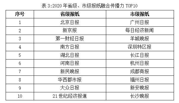 進入2020年報紙融合指數排行榜百強的報紙中,中央級報紙22家,省級報紙55家,省會城市及計劃單列市報紙23家。省級報紙中北京日報、新京報及第一財經日報位列前三,省會城市及計劃單列市報紙中,廣州日報、每日經濟新聞及羊城晚報位列前三。