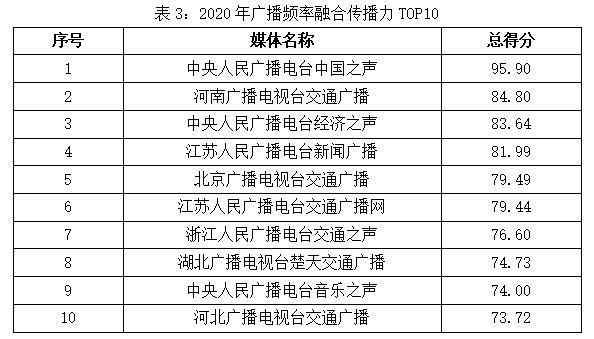 綜合廣播收聽率、網站、微博、微信、入駐聚合新聞客戶端、入駐聚合音頻客戶端、入駐聚合視頻客戶端、廣播自建客戶端等傳播情況,融合傳播力排名前十位的廣播頻率見表3:
