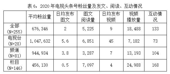 電視臺及其頻道和欄目開通的頭條號日均發布視頻9條,遠高于圖文發布量。其中電視臺開通的頭條號,日均發布45條視頻,高于頻道和欄目日均發布視頻數。