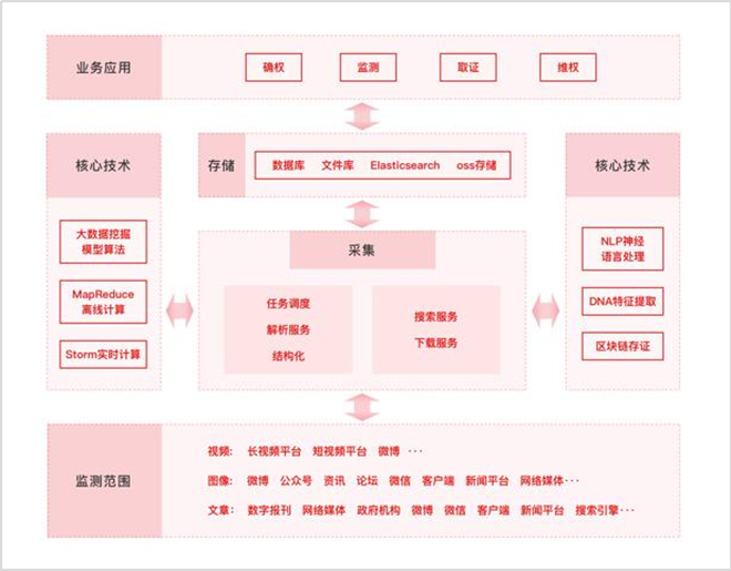 針對圖片、視頻業務完善業務閉環,打造了視頻登記、原創比對與內容審核三大核心功能區。實現了圖片特征基因提取與版權庫比對,即時上鏈存儲。利用區塊鏈、視頻基因提取與AI圖像識別技術、視頻水印添加與讀取技術,構建視頻特征 DNA 指紋系統,提供視頻登記上鏈、視頻監測、視頻比對等一系列全鏈路視頻版權服務。