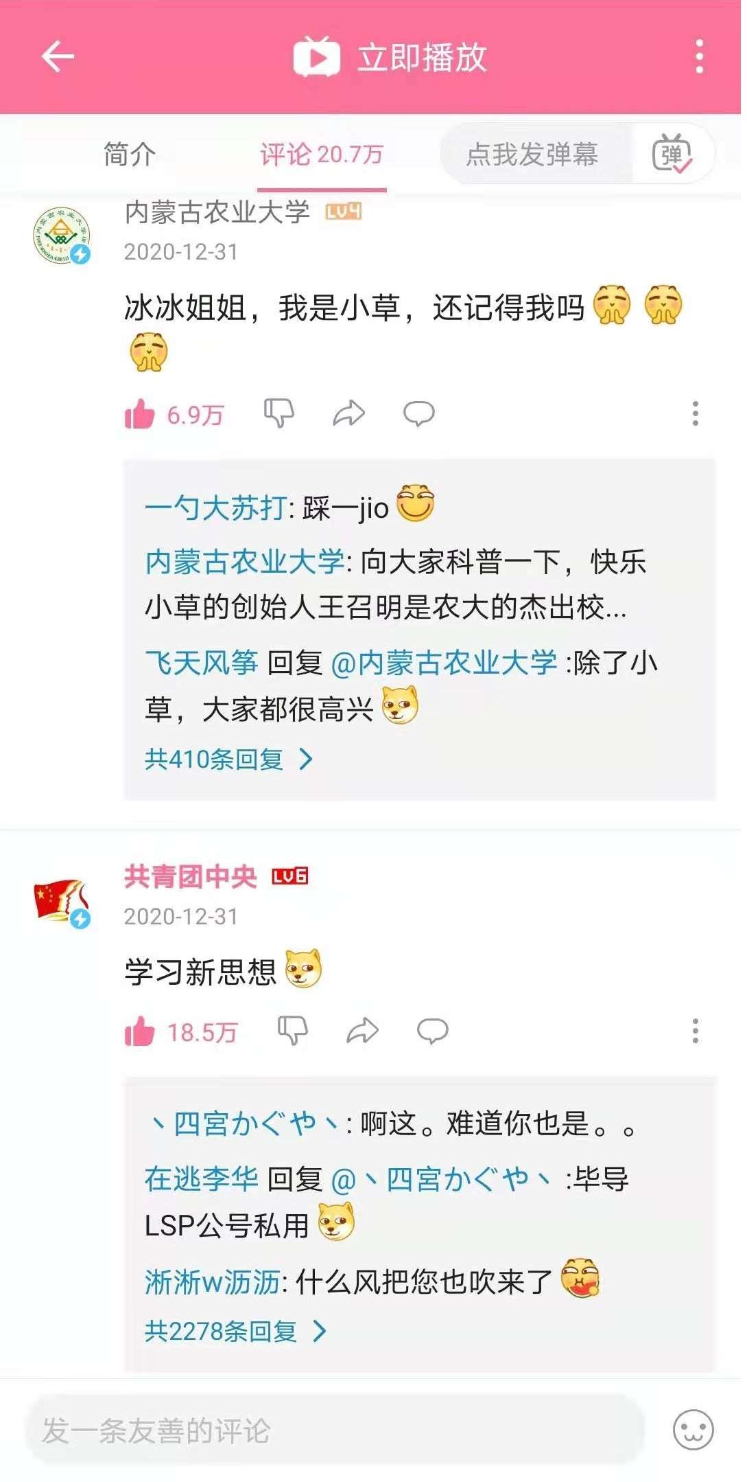 其二,主流敘事與受眾認同的甜蜜契合。隨著媒體融合進程的不斷加快,傳統主流媒體也打開新思路,尋找到了主流敘事與受眾認同的甜蜜契合。2020年11月,王冰冰主持線上主題團課“青年大學習”,向觀眾介紹位于遼寧丹東的抗美援朝紀念館。由于青年大學習的主要受眾就是大學生,王冰冰的空降,致使觀看人數過大,一度將系統擠垮到宕機。這就是主流媒體宣傳思路轉變后的一大成功探索。此外,在王冰冰、張揚等人入駐B站后的視頻評論區中,還經常能看到如共青團中央、中國警察網、中國火箭軍、各大高校等官方B站號的身影。網友“查干湖的特色胖頭魚”統計道,王冰冰首條B站視頻下的藍標官方號已經超過200個。