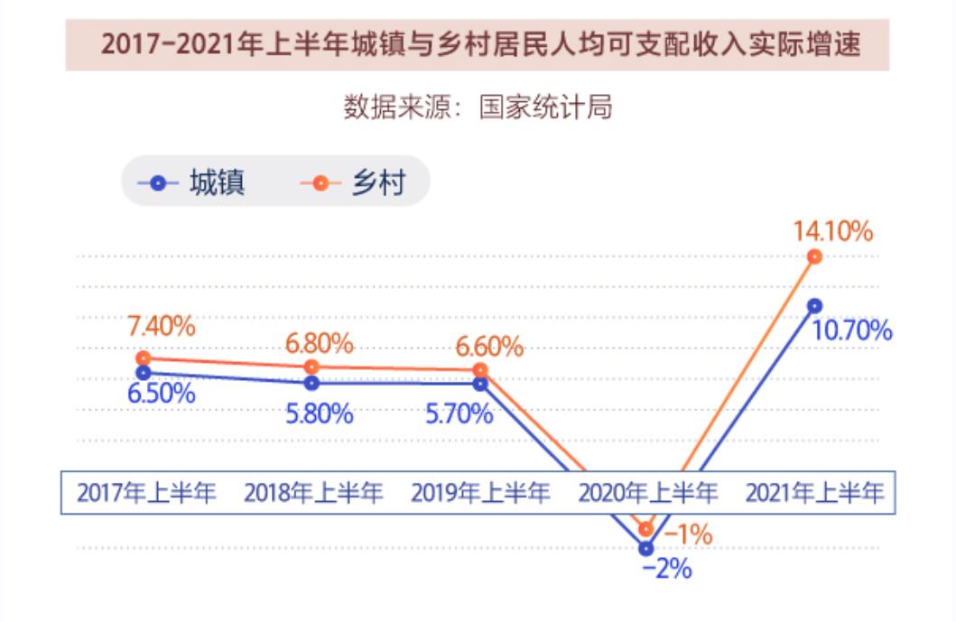國家統計局數據顯示,2021年上半年,鄉村居民人均可支配收入9248元,增長14.6%,扣除價格因素,實際增長14.1%,快于GDP增速(12.7%)1.4個百分點,快于城鎮增速(24125元,實際增速10.7%)3.4個百分點。