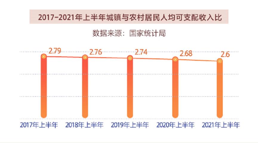 隨著鄉村居民收入增速持續快于城鎮,城鄉收入差距水平也進一步縮小。2021年上半年,城鎮居民與農村居民人均可支配收入之比為2.61,同比縮小了0.07,比2017年上半年縮小了0.18。