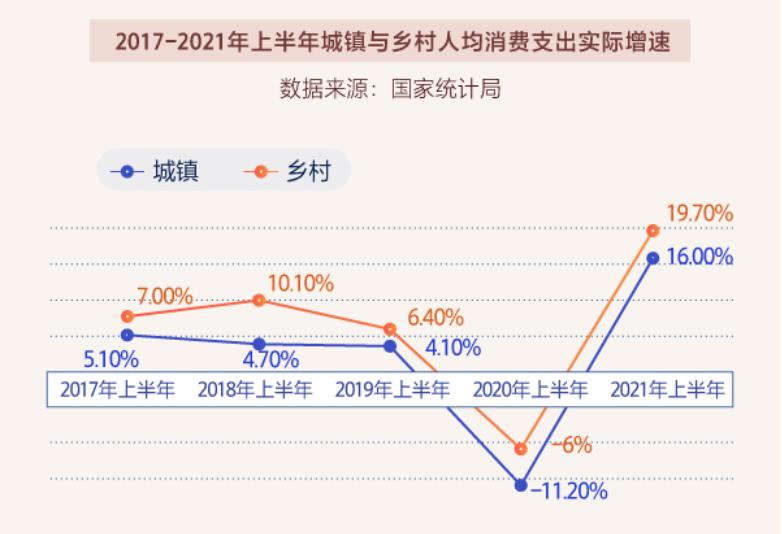 上半年,鄉村居民人均消費支出實際增速繼續快于城鎮。國家統計局數據顯示,2021年上半年,農村居民人均消費支出7464元,增長20.2%,扣除價格因素,實際增長19.7%。實際增速快于城鎮(14566元,實際增長16.0%)3.7個百分點。