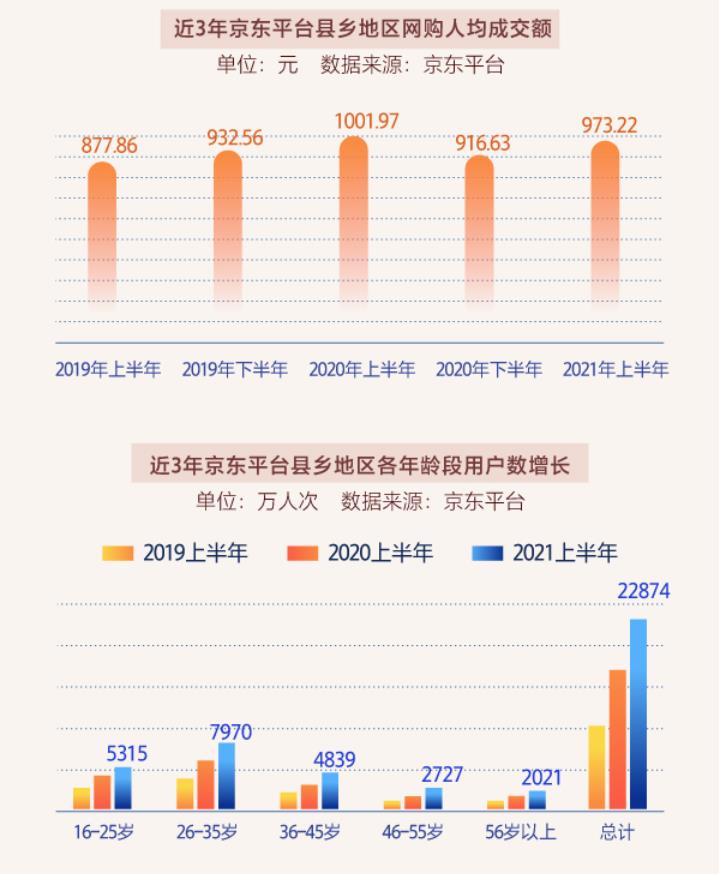 京東電商平臺數據顯示,2021上半年,縣鄉地區網購用戶數呈現穩定增長的態勢,同比增長25.88%,上半年縣鄉地區人均網購成交額近千元,同比增長近10%,人均網購商品銷量是2020上半年的4.7倍。從用戶年齡看,近3年增長最多的群體是46-55歲用戶,意味著原來缺少網購經驗的人群也開始網購了。