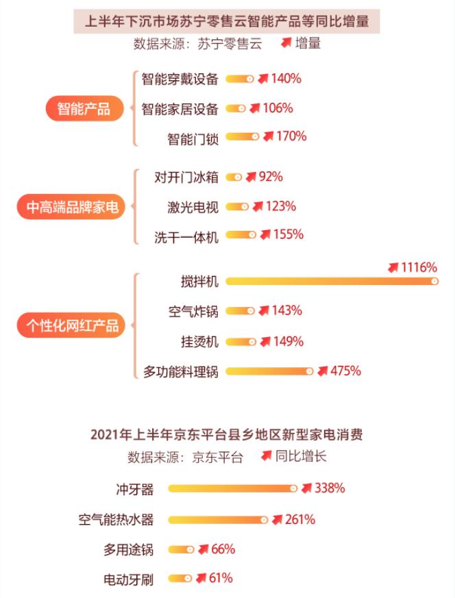 京東數據顯示,2021上半年,縣鄉地區沖牙器、空氣能熱水器銷量分別同比增長338%、261%,多用途鍋、電動牙刷、洗碗機銷量同比增長都超過了50%,平板電視、家庭影院、掃地機器人銷量同比增長都超過了30%。