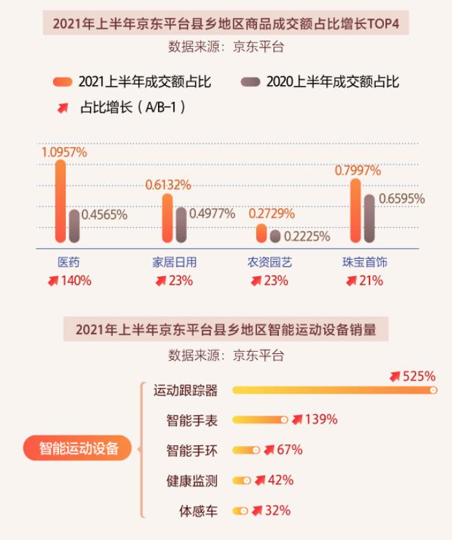 京東平臺數據顯示,2021上半年縣鄉地區網購的各品類商品成交額占比中,醫藥品類的占比提升最高,增長達140%。智能運動設備整體銷量同比增長93%。其中,運動跟蹤器銷量同比增長525%,智能手表銷量同比增長139%。健康監測產品銷量同比增長42%。