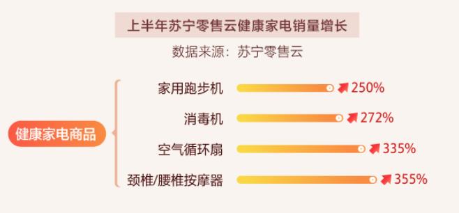 蘇寧零售云門店C端消費數據顯示:2021上半年,縣鄉地區健康家電銷量增長迅猛。家用跑步機銷量同比提升250%,消毒機銷量同比提升272%,空氣循環扇銷量同比增長335%,頸椎/腰椎按摩器銷量同比提升355%。