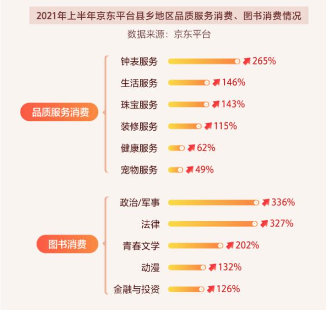 與此同時,2021上半年居民對品質服務消費和文化消費的需求日趨高漲。京東平臺數據顯示,上半年縣鄉地區鐘表服務銷量同比增長265%,生活服務、珠寶服務、裝修服務銷量同比增長都超過了100%?h鄉地區圖書整體銷量同比增長了50%。政治/軍事、法律類圖書銷量同比增長超過300%;青春文學銷量同比增長超過200%;動漫、金融與投資、雜志期刊銷量同比增長超過100%。蘇寧零售云門店C端銷售數據顯示,上半年,縣鄉地區延保服務銷量同比提升532%,顯示出縣鄉地區強勁的服務消費需求。