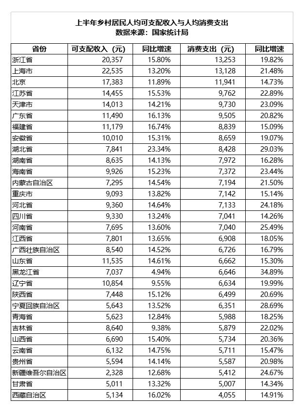 從消費地域看,上半年,全國鄉村居民收入與人均消費支出均持續恢復性增長。