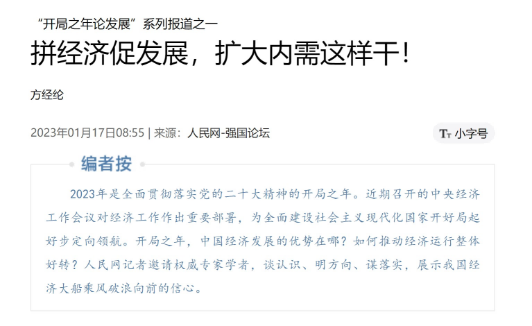 2023年是全面貫徹落實黨的二十大精神的開局之年,人民網強國論壇部邀請權威專家學者,談認識、明方向、謀落實,圍繞“開局之年論發展”主題,形成擴大內需這樣干、加快建設現代化產業體系、更大力度吸引和利用外資、民營經濟和民企發展壯大以及防范化解重大經濟金融風險共5篇稿件,營造了強信心、穩經濟的積極輿論氛圍,受到廣泛關注。5篇稿件中有4篇登上人民網首頁大頭條,受到高度認可:“發布及時,解讀到位”“熱點抓的準,成稿速度快”“客觀詳實,不夸大成績,不回避問題”。