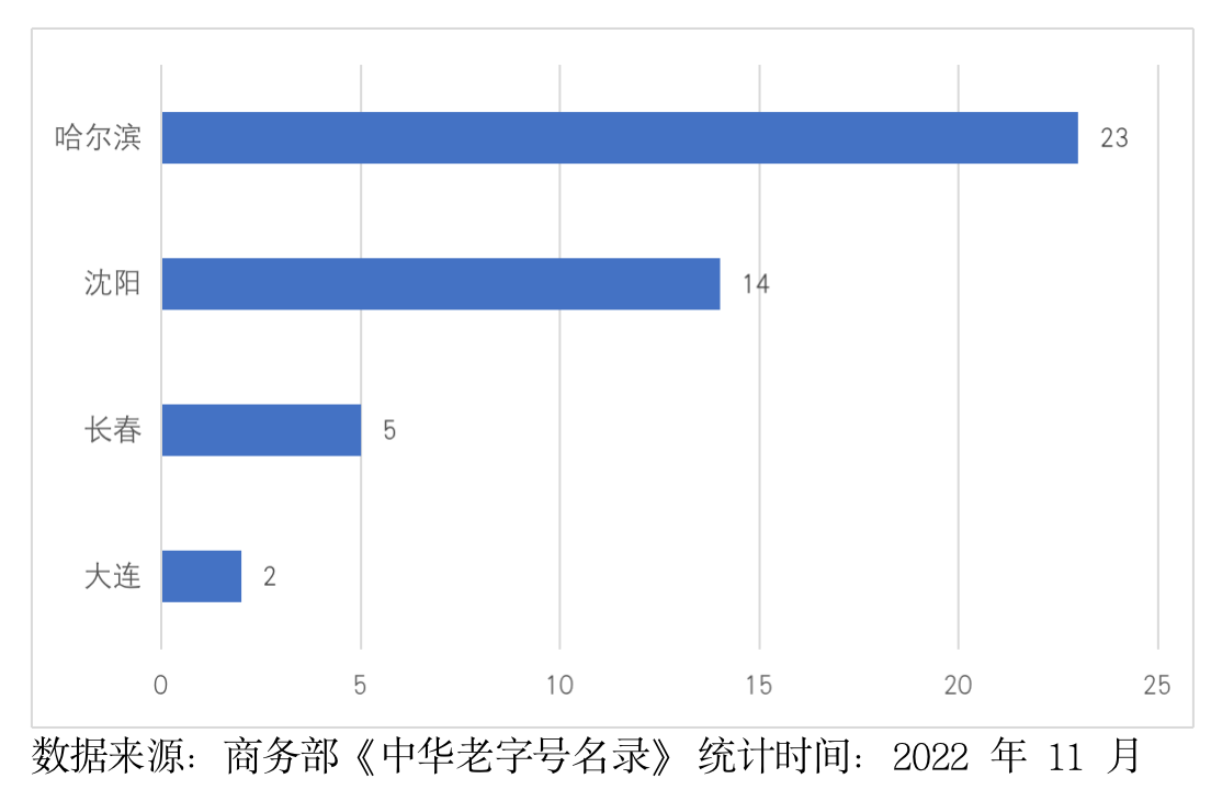 商務部“中華老字號品牌”城市數量數據顯示,哈爾濱擁有23家“中華老字號品牌”,沈陽、長春、大連分別有14家、5家、2家“中華老字號品牌”。